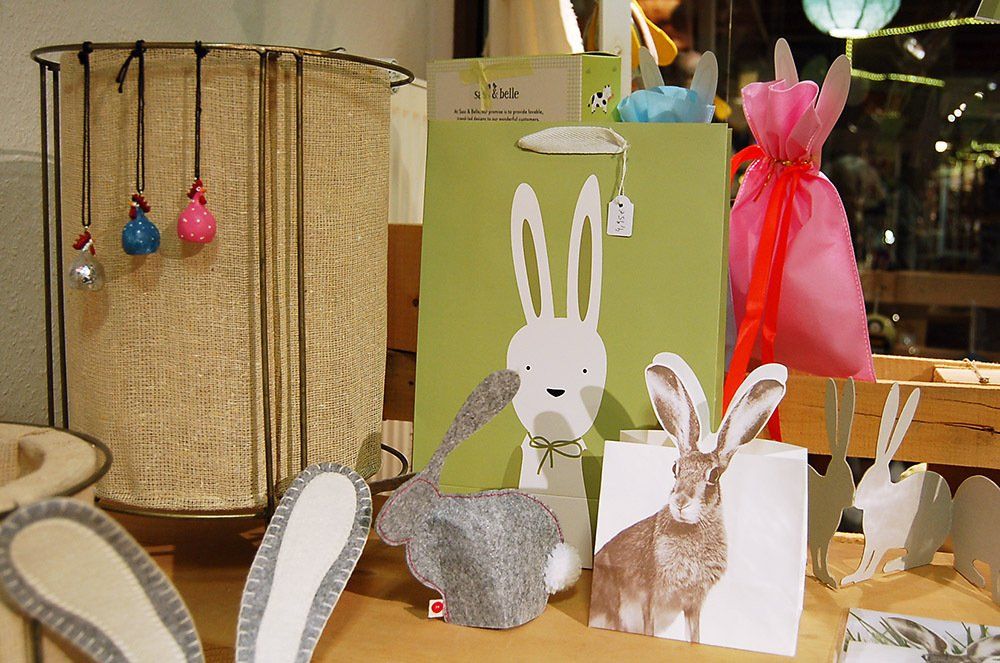 Glasdose mit Ohren, Porzellaneier-Set (stehend), Stoffhasen von Räder